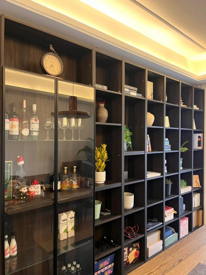 我本身不怎么喝酒,酒柜里就放了几瓶朋友送的酒,剩下的空间摆了点装饰品,那些格子最后也成了杂物收容所,钥匙、口罩、充电器全往里塞,又显得乱糟糟的,毫无美感。